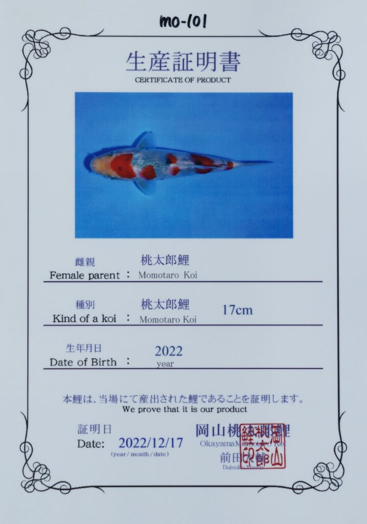 大正三色 オス 35cm 2024 9/06 錦鯉 大正三色 2024年5月22日2024年9月6日 品種大正三色性別オスサイズ35cm生産者岡山桃太郎鯉雌親桃太郎鯉生産年2022年 ¥50,000(税込) ご購入・見学希望の方はメール又はお電話でお気軽にお問合せください。 お問合せ 生産証明書 錦鯉に関する相談お問合せ TEL:090-3081-1081 メールによるお問合せ 錦鯉 大正三色 白写り 25cm イエローマジック メス 35cm 関連記事 丹頂昭和 62cm 2025年2月11日 昭和三色 58cm 2025年1月16日 昭和 42cm 2025年1月16日 昭和三色 41cm 2025年1月16日 紅白 75cm 2025年1月16日 高野三色 54cm 2025年1月16日 丹頂 58cm 2025年1月16日 緋写り 60cm 2025年1月11日