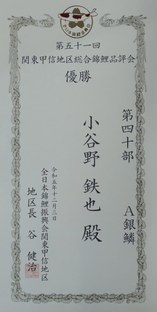 第54回錦鯉全国若鯉品評会第40部準優勝賞状
