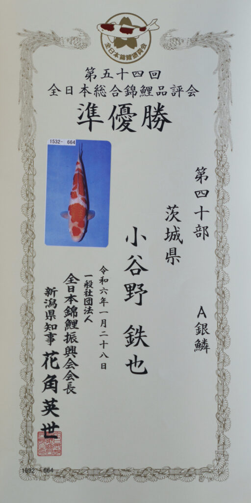 令和6年1月28日 第54回全日本錦鯉品評会 準優勝